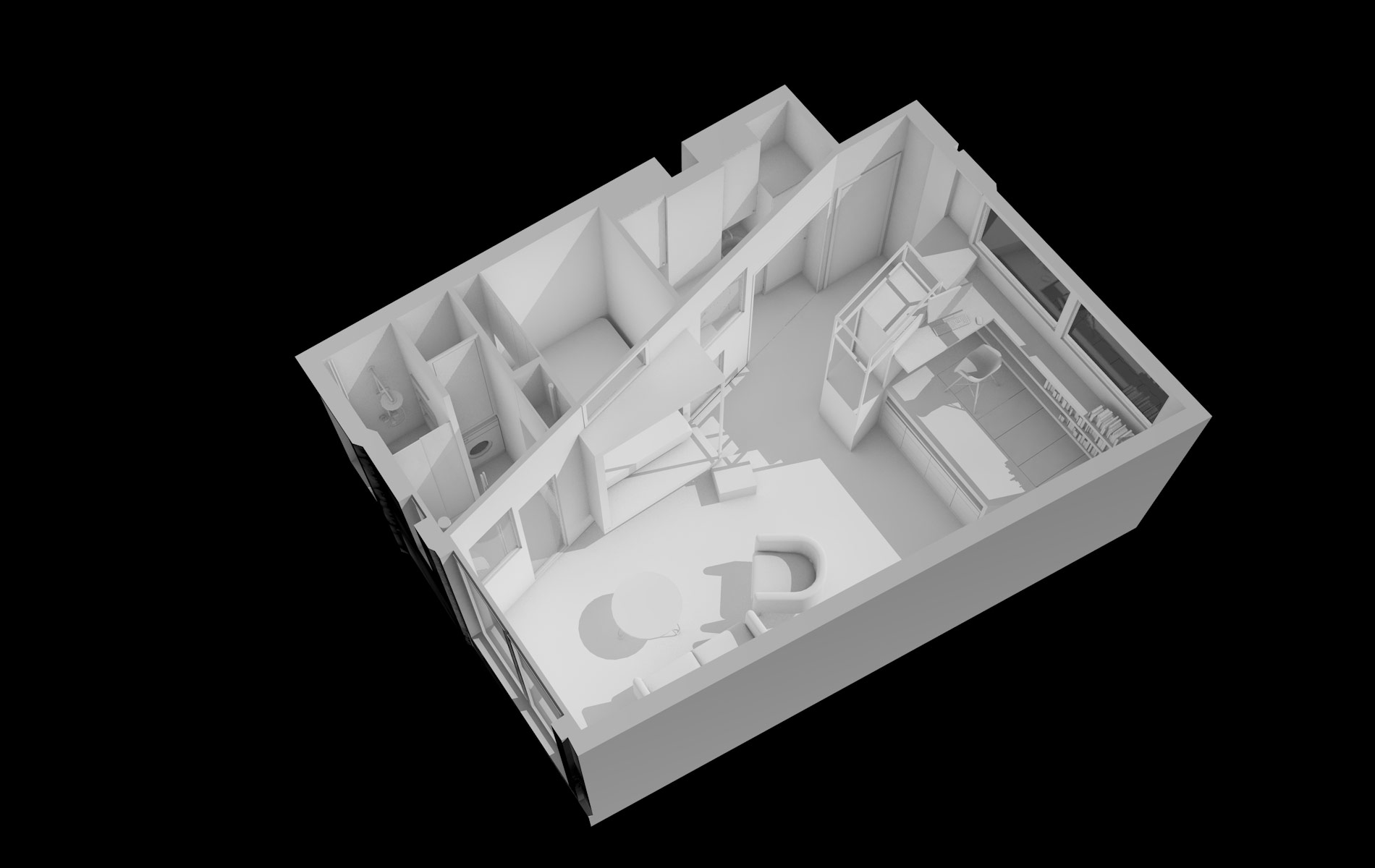 Ce petit studio a été conçu pour une future retraité. Même si l’optimisation fut la base de mon travail, l’une des priorités était également de pouvoir « enfin » voir le jardin voisin et sa végétation par la fenêtre anormalement haute dans cet appartement. Etrangement cette fenêtre se situe à 1,90 m de haut. Impossible donc de jouir de sa vue. D’ou la création de cette estrade regorgeant de rangements et créant un petit coin bureau dominant d’une part l’appartement mais surtoutle joli coin de verdure offert par le voisinage.