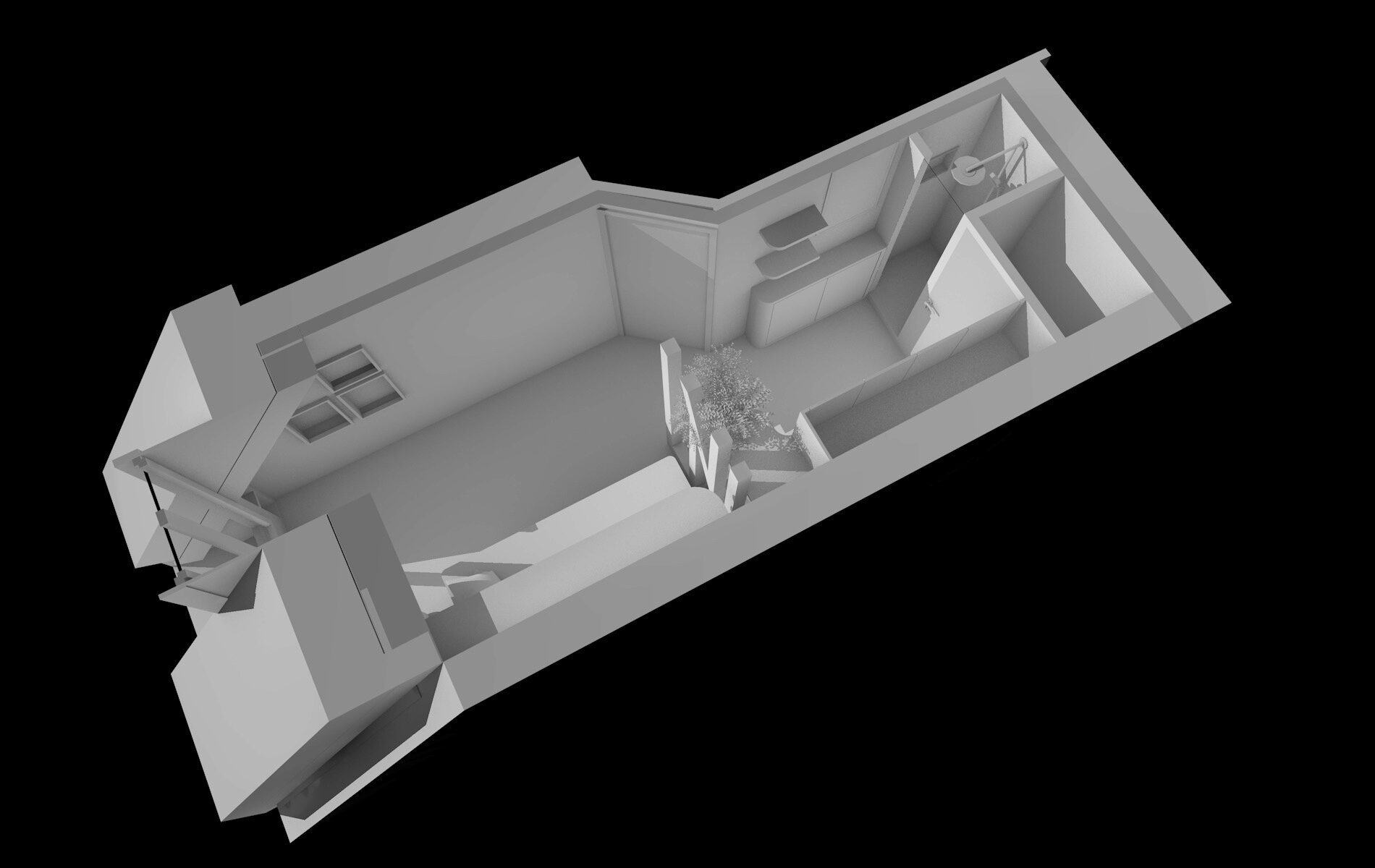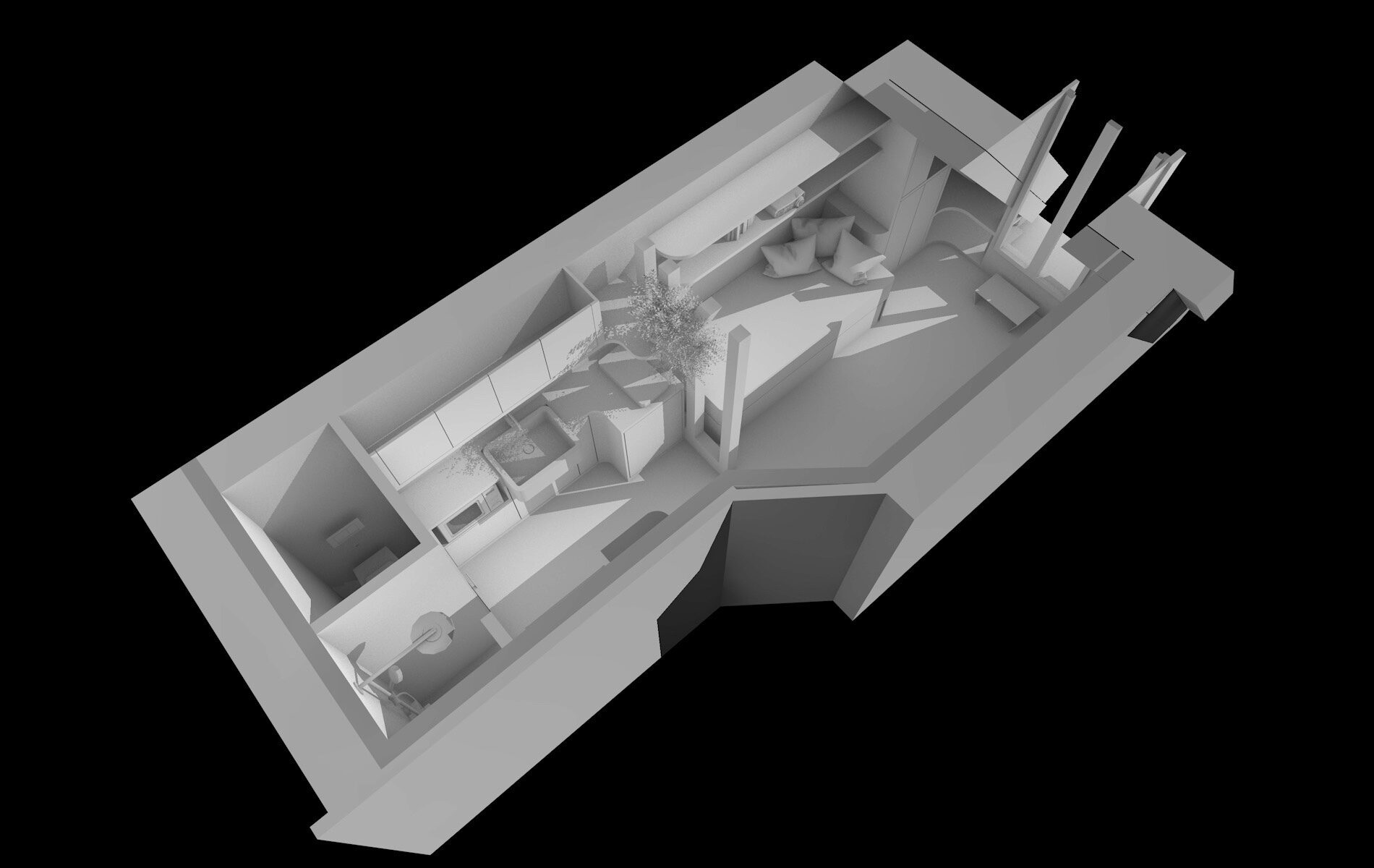 Cuisine compacte, rangements, coin nuit et salle d’eau cohabitent dans un équilibre précis, où chaque fonction trouve sa place dans une surface extrêmement réduite.
