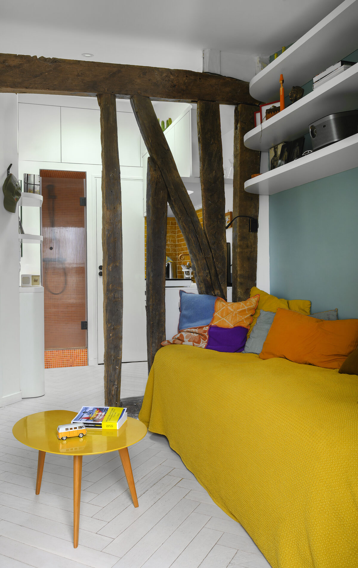 Perché sous les toits parisiens, ce studio de 12 m² incarne parfaitement les contraintes typiques des petites surfaces : volumes atypiques, faible hauteur, structure existante marquée.