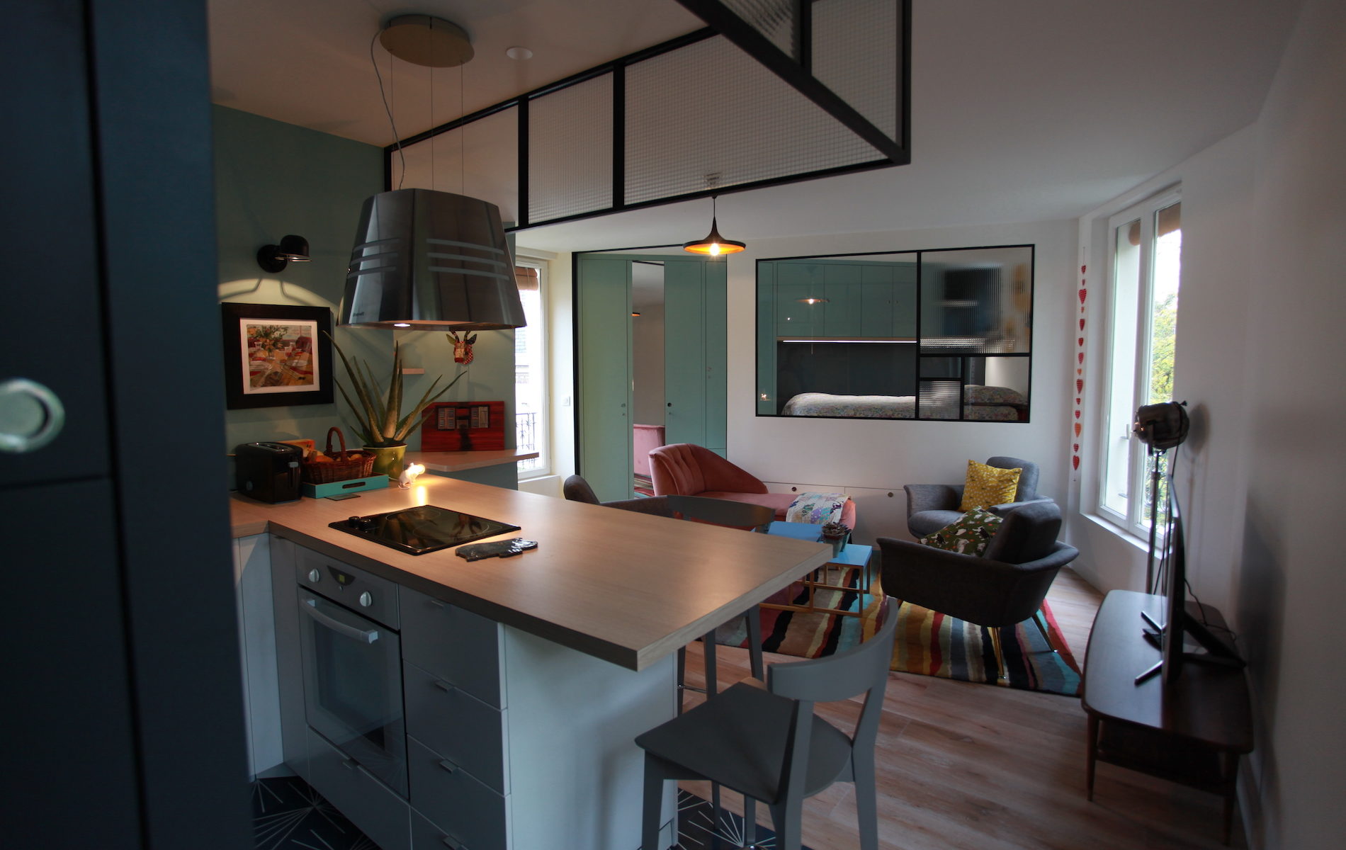 De la lumière et de la couleur. Voici en 2 mots le gros du cahier des charges, mais il fallait aussi pouvoir glisser un matelas 2 places pour recevoir un couple d’amis de passage. C’est sous l’estrade de la chambre que ce trouve celui-ci.